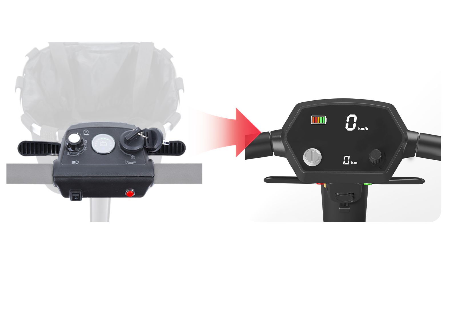 Los indicadores analógicos originales de batería y velocidad no son fáciles de usar para usuarios mayores con problemas de visión. La versión mejorada cuenta con una pantalla digital LED de alta definición**, que muestra con precisión la velocidad actual, la batería restante y el modo de conducción en tiempo real. El nivel de la batería se indica claramente mediante tres colores: verde, amarillo y rojo, lo que proporciona un recordatorio visual para cargar cuando esté bajo. La visualización de la velocidad tiene una precisión de 0,1 km/h y con la perilla de ajuste de velocidad (ajustable de 2 a 8 km/h), los usuarios pueden controlar con mayor precisión su ritmo de conducción, evitando la incomodidad de las fluctuaciones de velocidad.